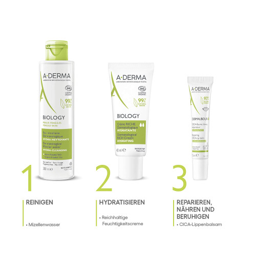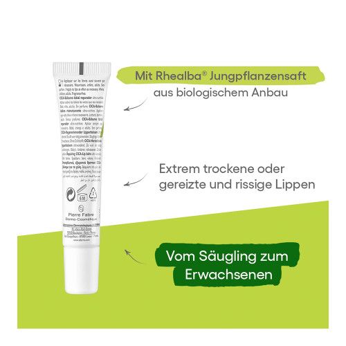 Es wurde entwickelt, um gereizte, rissige, spröde und sehr trockene Lippen (Wetterbedingungen, reizende und austrocknende Behandlungen usw.) zu beruhigen, nach 24 Stunden* zu reparieren und zu nähren. Es besteht zu 97 % aus natürlichen Aktivstoffen. Es pflegt die Lippen dank Rhealba® Hafer-Jungpflanzen-Extrakt und den enthaltenen Pflanzenölen und -buttern (Jojoba, Shea, Sonnenblume). Außerdem enthält es reinigende Mineralstoffe (Zinksulfat, das die Vermehrung von Bakterien begrenzt).