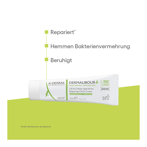 DERMALIBOUR+ Reparierende CICA-Creme* ist eine Anti-Irritations-Pflege für die ganze Familie, die sofort beruhigt, die gereizte Stelle reinigt und die Hautreparatur fördert.