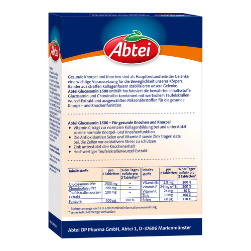 Abtei Glucosamin 1500 Plus enthält hochdosiert die bewährten Inhaltsstoffe Glucosamin und Chondroitin kombiniert mit wertvollem Teufelskrallenwurzel-Extrakt und ausgewählten Mikronährstoffen für die gesunde Knorpel- und Knochenfunktion.