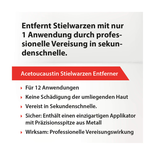 Der Acetocaustin® Stielwarzen Entferner bietet eine rezeptfreie Lösung zur Entfernung gewöhnlicher Stielwarzen. Er enthält Dimethylether in einem unter Druck stehenden Behälter und wird mit einem speziellen Applikator geliefert, der die Kälte direkt auf die Stielwarze überträgt. Diese Methode ist eine rezeptfreie Alternative zu den Behandlungen, die auch in Arztpraxen angewendet wird, und ermöglicht es, Stielwarzen schnell und erfolgreich zu Hause zu behandeln.