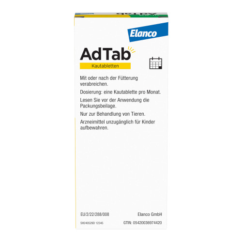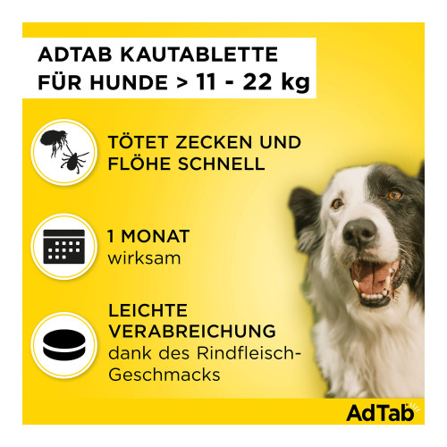 AdTab Kautabletten für Hunde. Wirkstoff: Lotilaner. Anwendungsgebiete: Zur Behandlung von Floh- und Zeckenbefall bei Hunden. Dieses Tierarzneimittel besitzt eine sofortige und anhaltend abtötende Wirkung gegen Flöhe (Ctenocephalides felis und C. canis) und Zecken (Ixodes ricinus) für die Dauer eines Monats. Flöhe und Zecken müssen am Wirt anheften und mit der Nahrungsaufnahme beginnen, um dem Wirkstoff ausgesetzt zu werden.