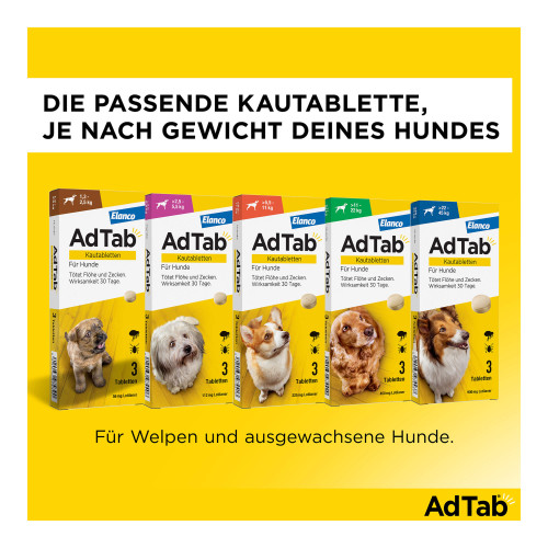 AdTab Kautabletten für Hunde. Wirkstoff: Lotilaner. Anwendungsgebiete: Zur Behandlung von Floh- und Zeckenbefall bei Hunden. Dieses Tierarzneimittel besitzt eine sofortige und anhaltend abtötende Wirkung gegen Flöhe (Ctenocephalides felis und C. canis) und Zecken (Ixodes ricinus) für die Dauer eines Monats. Flöhe und Zecken müssen am Wirt anheften und mit der Nahrungsaufnahme beginnen, um dem Wirkstoff ausgesetzt zu werden.