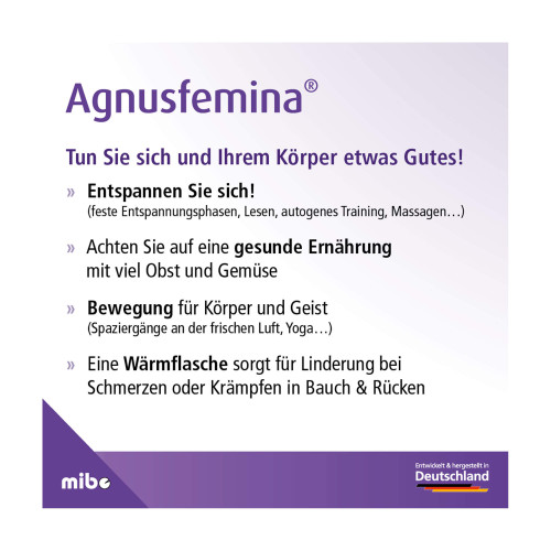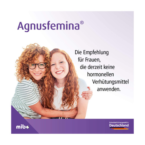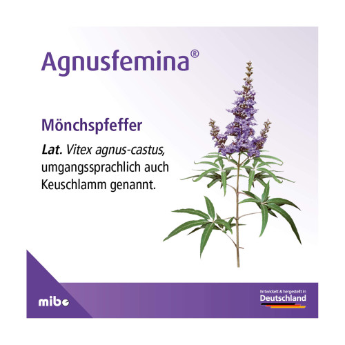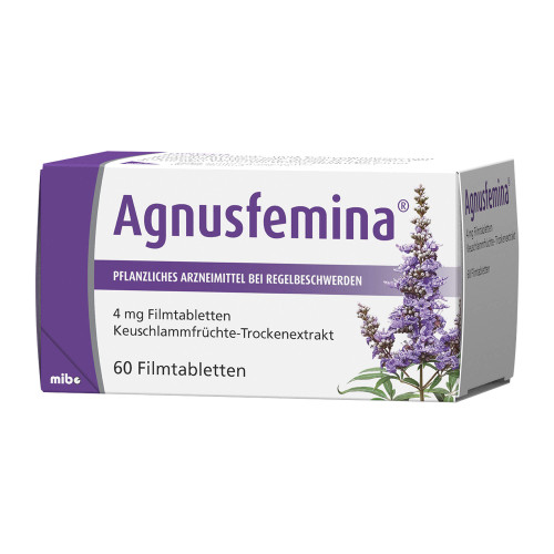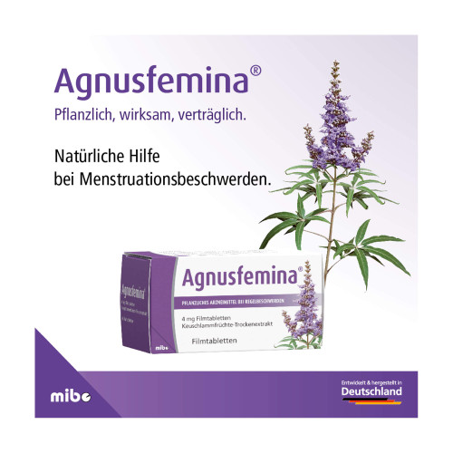 Agnusfemina 4 mg Filmtabletten. Wirkstoff: Keuschlammfrüchte-Trockenextrakt. Anwendungsgebiete: Bei Rhythmusstörungen der Regelblutung (Regeltempoanomalien), Spannungs- und Schwellungsgefühl in den Brüsten (Mastodynie) und bei monatlich wiederkehrenden Beschwerden vor Eintritt der Regelblutung (prämenstruelle Beschwerden). Warnhinweis: Enthält Lactose und Glucose.