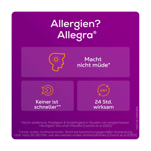 Allegra Allergietabletten enthalten den Wirkstoff Bilastin, ein Antihistaminikum. Allegra Allergietabletten werden angewendet, um die Beschwerden von allergischer Rhinokonjunktivitis (Niesen, juckende, laufende, verstopfte Nase und rote und tränende Augen) bei saisonalen Formen (z. B. Heuschnupfen) sowie bei ganzjährigen Formen (z. B. Hausstaubmilbenallergie) zu lindern. Sie können auch angewendet werden, um juckende Hautausschläge (Nesselsucht oder Urtikaria) zu behandeln.