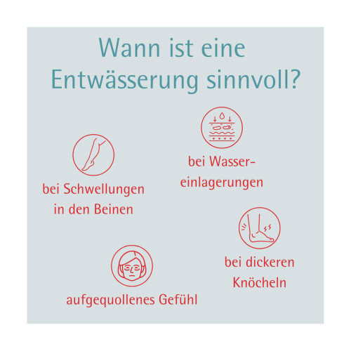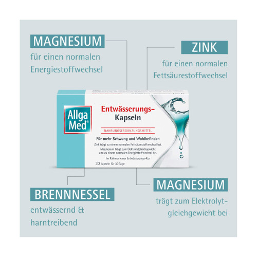 Einer der wichtigsten Bestandteile des Körpers ist Wasser. Durch äußerliche Faktoren wie Hitze oder auch Bewegungsmangel kann der Körper mehr Wasser einlagern. Ein Zuviel kann unseren Körper belasten. Magnesium trägt zum Elektrolytgleichgewicht und zu einem normalen Energiestoffwechsel bei. Zink trägt zu einem normalen Fettsäurestoffwechsel bei. Das Nahrungsergängzungsmittel enthält zudem Cranberry-Saft-Konzentrat, Brennesselkraut-Extrakt und Apfelessig-Pulver. Zusätzlich hilft eine ausgewogene Ernährung, reichlich Flüssigkeitszufuhr und viel Bewegung. Im Rahmen einer Entwässerungskur kann das Elektrolytgleichgewicht unterstützt werden.