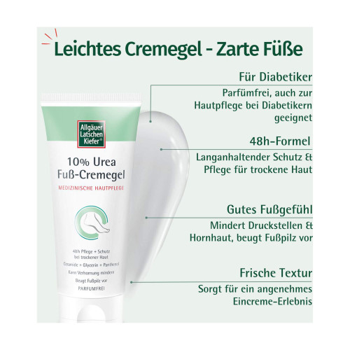 Die parfümfreie Formel fühlt sich an den Füßen leicht und zart an, zieht schnell ein und hinterlässt ein angenehmes, gepflegtes Hautgefühl. Die Anwendung des Cremegels hilft, Fußpilz vorzubeugen. Die enthaltenen feuchtigkeitsspendenden und regenerativen Wirkstoffe sorgen dafür, dass die Haut nicht austrocknet und ihre natürliche Barrierefunktion gestärkt wird. Eine gut durchfeuchtete, intakte Hautoberfläche bildet eine weniger einladende Umgebung für Pilze und andere Mikroorganismen, die Fußinfektionen verursachen können. Diese präventive Wirkung ist insbesondere für Menschen mit empfindlicher Haut oder erhöhtem Risiko, wie Diabetiker, von Bedeutung, da sie häufig anfälliger für Hautinfektionen sind.
