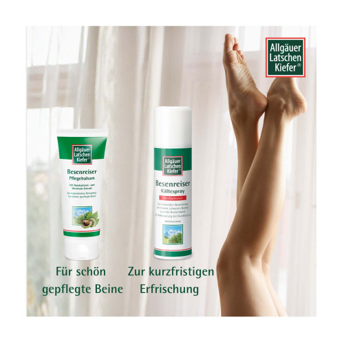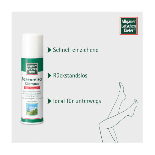 Das Besenreiser Kältespray von Allgäuer Latschenkiefer wurde speziell entwickelt, um beanspruchte Beine zu erfrischen. Die angenehm kühlende Wirkung auf der Haut sorgt für eine schnelle Verbesserung des Körpergefühls – besonders an warmen Tagen oder nach längerem Sitzen oder Stehen.