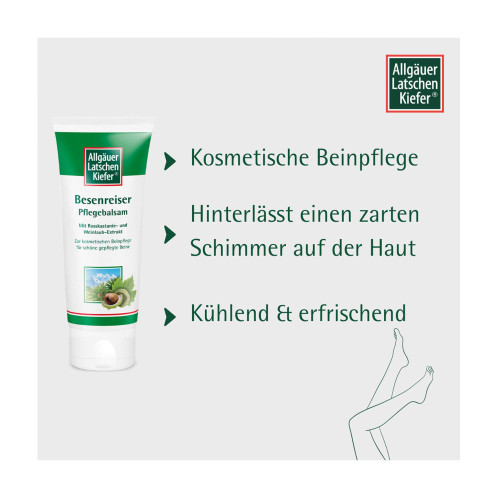 Der Besenreiser Pflegebalsam von Allgäuer Latschenkiefer wurde speziell zur kosmetischen Unterstützung bei Besenreisern entwickelt. Die sorgfältig abgestimmte Rezeptur kombiniert pflanzliche Extrakte aus Rosskastanie und Weinlaub, die traditionell zur Hautpflege der Beine eingesetzt werden. Menthol, Panthenol, Allantoin und Latschenkiefernöl sorgen beim Einreiben für ein angenehmes Frischegefühl und eine wohltuende Pflegewirkung. Die Haut fühlt sich nach der Anwendung erfrischt, gepflegt und belebt an. Der Balsam hinterlässt einen leichten Schimmer auf der Haut, der die Beine nochmal erfrischter aussehen lässt.