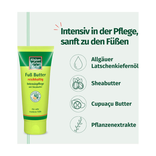 Für samtweiche Füße – die reichhaltige Fußbutter pflegt intensiv mit einer Kombination aus Latschenkiefernöl, Sheabutter und Cupuacu Butter.