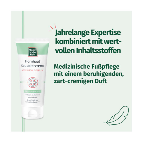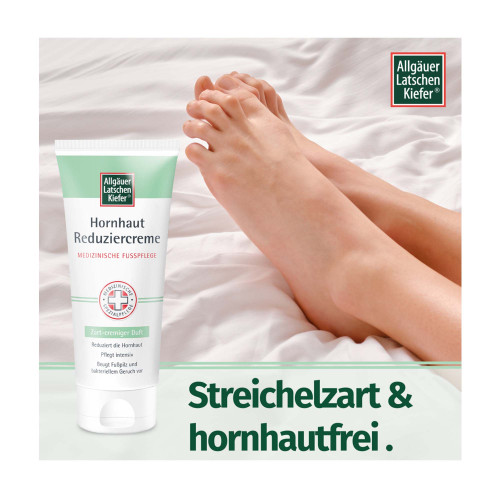 Die Hornhaut Reduziercreme Cremig von Allgäuer Latschenkiefer ist eine Fußpflege, die jahrelange Expertise mit wertvollen Inhaltsstoffen kombiniert. Sie wirkt sanft, aber dennoch effektiv bei der Reduzierung unerwünschter Hornhaut. Ihre Anti-Hornhaut-Formel kombiniert wertvolle Fruchtsäuren, wie Salicyl- und Glykolsäure, um Hornhaut gezielt zu reduzieren und das Hautbild sichtbar zu verbessern – und das bereits innerhalb weniger Tage.
