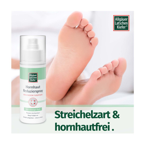 Das Hornhaut Reduzierspray von Allgäuer Latschenkiefer reduziert störende Hornhaut ganz ohne zusätzliche Arbeitsschritte. Die Fußpflege vereint jahrelange Expertise mit wertvollen Inhaltsstoffen.
