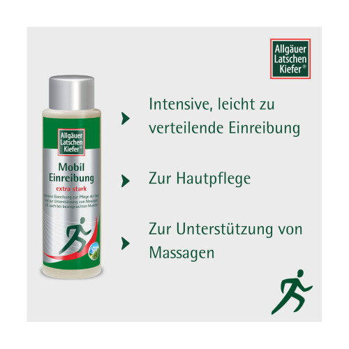 Die Allgäuer Latschenkiefer Mobil Einreibung extra stark vereint Allgäuer Latschenkiefernöl mit bewährten Pflanzenextrakten und pflegenden Wirkstoffen. Die Einreibung ist ideal für alle, die beanspruchte Muskeln durch eine Massage lockern und zugleich die Haut pflegen möchten.