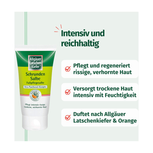 Die Schrundensalbe Orange von Allgäuer Latschenkiefer wurde entwickelt, um derartigen Herausforderungen entgegenzuwirken. Sie pflegt intensiv trockene, rissige oder verhornte Haut und unterstützt die Hautregeneration. Ihre Formulierung kombiniert das bewährte Allgäuer Latschenkiefernöl mit einem Urea-Panthenol-Komplex, der intensiv Feuchtigkeit spendet. Zusätzlich enthält die Salbe eine Pflegekombination mit Rosskastanie und Hamamelis, welche die Regeneration der Haut unterstützt. Während des Auftragens verströmt sie den traditionellen Duft von Allgäuer Latschenkiefer und Orange.