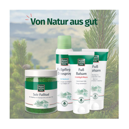 Nach dem Fußbad empfiehlt sich das Eincremen mit dem Fuß Balsam (PZN 03915183) von Allgäuer Latschenkiefer, der die Füße zusätzlich pflegt und mit Feuchtigkeit versorgt – so wird die Pflegeroutine zu einer Rundum-Kur für beanspruchte Füße.