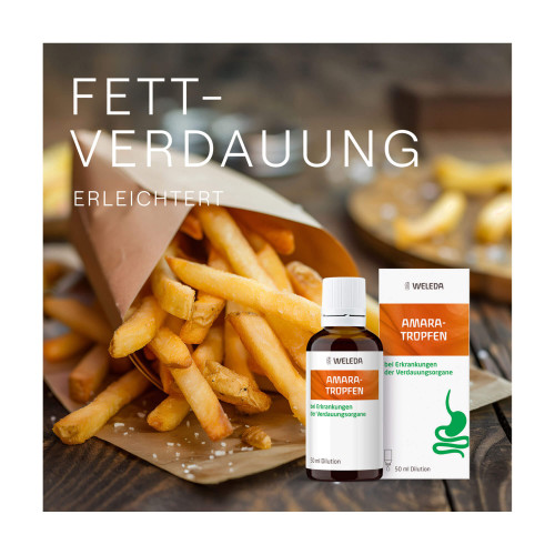 Bei Störungen der Verdauungstätigkeit und bei Beschwerden wie Übelkeit oder Völlegefühl werden Amara-Tropfen zur Intensivierung der Verdauung 1 Stunde nach dem Essen eingenommen.