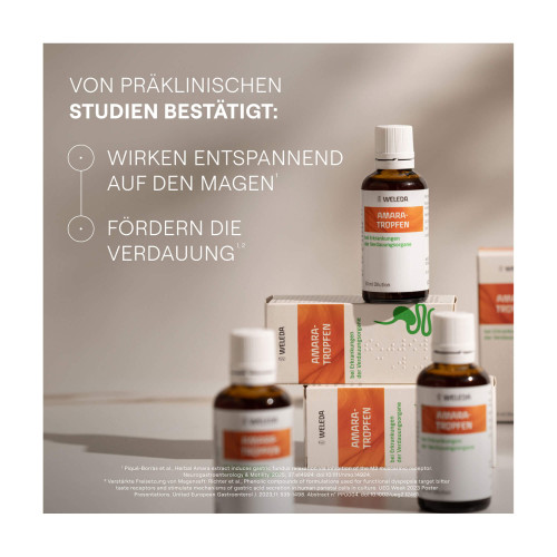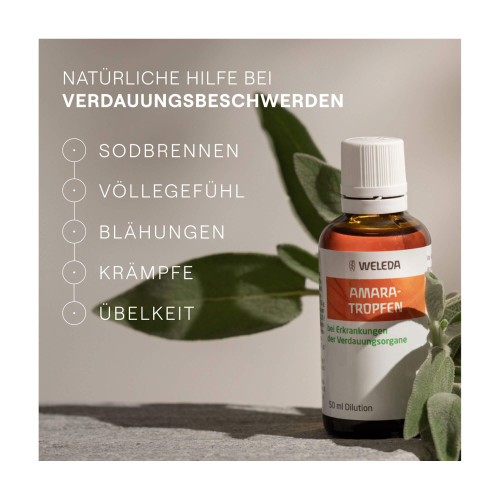 Amara-Tropfen, Dilution. Anwendungsgebiete: Gemäß der anthroposophischen Menschen- und Naturerkenntnis. Dazu gehören: Funktionelle Störungen von Bildung und Absonderung der Verdauungssäfte; Störungen der Bewegungsabläufe von Magen und Dünndarm sowie deren Folgezustände, z.B. Sodbrennen, Appetitlosigkeit, Übelkeit, Völlegefühl nach dem Essen. Warnhinweis: Enthält 91 mg Alkohol (Ethanol) pro 15 Tropfen entsprechend 27 % (m/m).