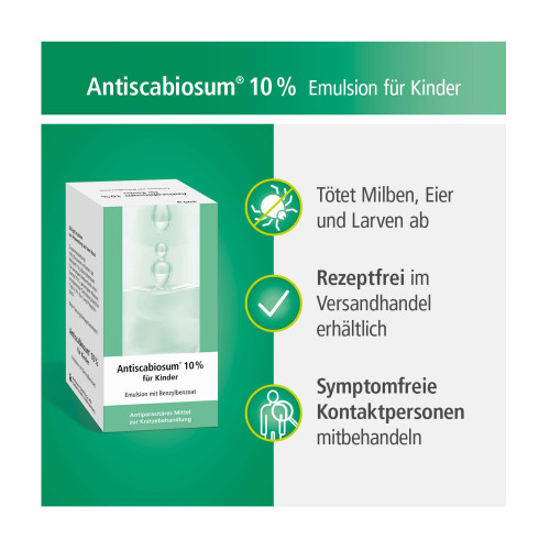 Antiscabiosum® 10 % für Kinder, Emulsion. Wirkstoff: Benzylbenzoat. Anwendungsgebiete: Behandlung von Krätze bei Kindern über 6 Jahren, als weniger toxisches Mittel, alternativ zu ausreichend untersuchten Antiscabiosa. Kinder von 1 bis 6 Jahren dürfen nur behandelt werden, wenn keine zusätzlichen Hautschäden bestehen, welche die Aufnahme des Wirkstoffs begünstigen könnten und wenn die Behandlung unter sorgfältiger ärztlicher Kontrolle erfolgt. Warnhinweis: Enthält Cetylstearylalkohol und Propylenglycol.