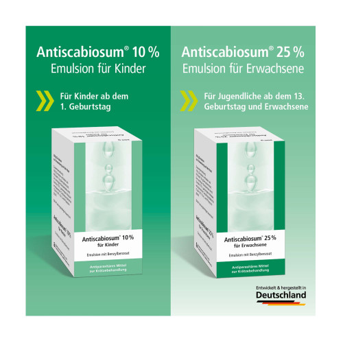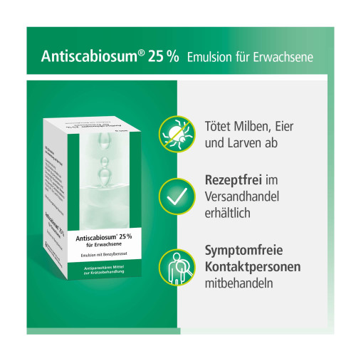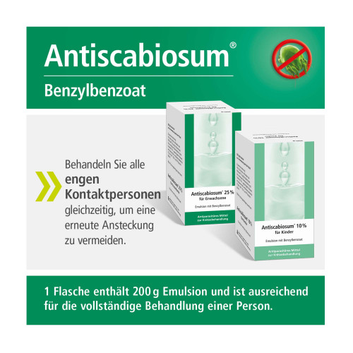 Antiscabiosum® 25 % für Erwachsene, Emulsion. Wirkstoff: Benzylbenzoat. Anwendungsgebiete: Zur Behandlung von Krätze bei Erwachsenen, als weniger toxisches Mittel, alternativ zu ausreichend untersuchten Antiscabiosa. Warnhinweis: Enthält Cetylstearylalkohol und Propylenglycol.