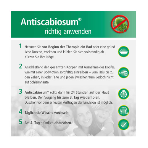 - Bevor Sie mit der Behandlung beginnen, sollten Sie Ihren Körper gründlich reinigen (Vollbad oder Dusche) und gegebenenfalls die Nägel kürzen. Vor dem erneuten Anwenden an den beiden folgenden Tagen dürfen Sie auch duschen. Tragen Sie Antiscabiosum 25% immer erst auf, wenn die Haut vollkommen trocken und die Körpertemperatur wieder normal ist, also etwa 60 Minuten nach dem Duschen. An 3 aufeinander folgenden Tagen reiben Sie Ihren Körper lückenlos vom Hals bis zu den Zehen sorgfältig mit Antiscabiosum 25% ein. Tragen Sie die Emulsion dünn auf und verteilen sie gleichmäßig, so wie Sie es auch mit einem Sonnenschutzmittel tun würden. Der zeitliche Abstand zwischen den Anwendungen sollte etwa 24 Stunden betragen.