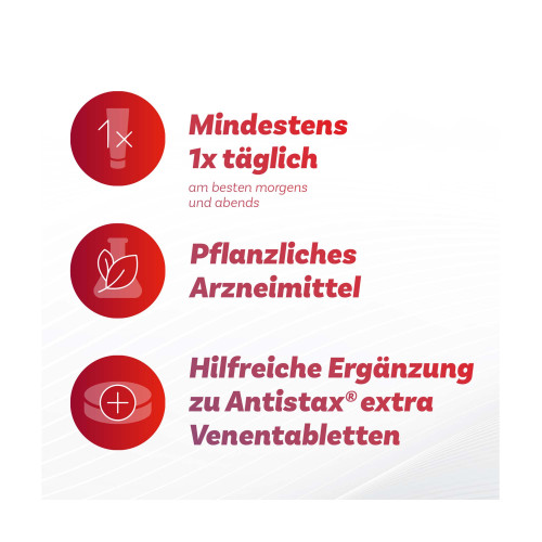Antistax® Venencreme, 282 mg/10 g. Wirkstoff: Rote Weinrebenblätter-Dickextrakt. Anwendungsgebiete: Zur Anwendung bei Erwachsenen. Traditionell angewendet zur Linderung von Beschwerden und Schweregefühl der Beine im Zusammenhang mit leichten venösen Durchblutungsstörungen. Antistax® Venencreme ist ein traditionelles pflanzliches Arzneimittel, das ausschließlich aufgrund langjähriger Anwendung für das Anwendungsgebiet registriert ist. Warnhinweise: Enthält Cetylstearylalkohol und Propylenglycol.