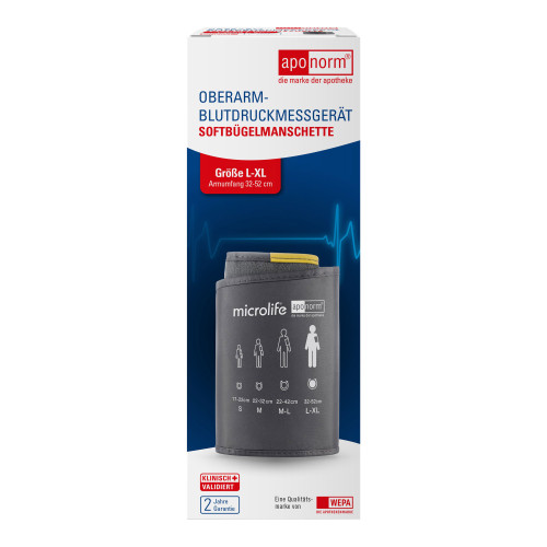 Die aponorm® Softbügelmanschette Gr. L-XL ist ideal bei größerem Oberarmumfang zw. 32-52cm. Sie ist eine der wenigen Manschetten am deutschen Markt, die für diesen Oberarmumfang eine eigene klinische Validierung besitzt und damit auch für diese Oberarmgrößen den Blutdruck nachgewiesen korrekt ermittelt. Passend für alle aponorm® Oberarmmodelle (Anschluss an ältere Gerätegenerationen über beiliegenden Adapter-Anschlussstecker möglich).