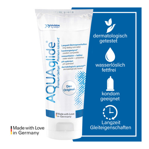 Kristallklar, angenehmsensitiv und äußerst hautfreundlich. AQUAglide ist optimal für den vaginalen, analen oder oralen Gebrauch und auch sehr gut gemeinsam mit Latexkondomen und Lovetoys (auch aus Silikon) geeignet