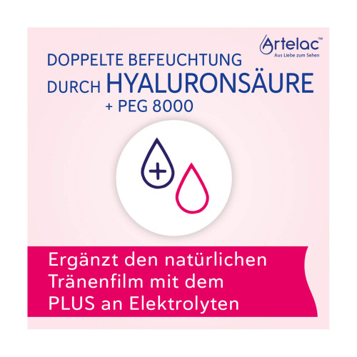 Bestimmte Umwelteinflüsse, aber auch körpereigene Faktoren, können tagsüber zu empfindlich-irritierten trockenen Augen führen. Die beruhigenden Augentropfen Artelac® Rebalance schaffen Abhilfe: Sie ergänzen den natürlichen Tränenfilm mit zusätzlichen Elektrolyten und befeuchten die Augen mit Hyaluronsäure und dem Inhaltsstoff PEG 8000, der Wasser auf der Augenoberfläche, im Tränenfilm bindet.