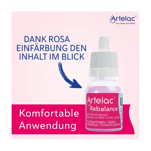 Artelac® Rebalance ist eine klare, rosafarbene Augentropfenlösung, die 0,15 % Natriumhyaluronat, 0,5 % Polyethylenglykol 8000 (PEG 8000), Kaliumchlorid, Calciumchlorid, Magnesiumchlorid, Natriumchlorid, Vitamin B12, Wasser für Injektionszwecke, Borsäure und Oxyd® (ein sanftes Konservierungsmittel, das an der Augenoberfläche in Wasser, Sauerstoff und Salz umgewandelt wird) enthält.