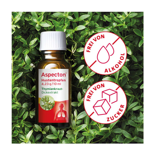 Aspecton Hustentropfen, Flüssigkeit zum Einnehmen. Wirkstoff: Dickextrakt aus Thymiankraut. Anwendungsgebiete: Zur Besserung der Beschwerden bei Erkältungskrankheiten der Atemwege mit zähflüssigem Schleim, zur Besserung der Beschwerden bei akuter Bronchitis. Warnhinweise: Enthält Propylenglycol, Eukalyptusöl und Levomenthol.