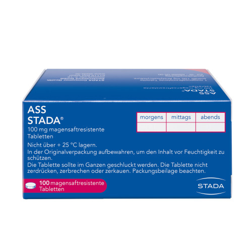 ASS STADA 100 mg magensaftresistente Tabletten. Wirkstoff: Acetylsalicylsäure. Anwendungsgebiete: Wird angewendet, um das Risiko der Entstehung von Blutgerinnseln zu verringern und folgenden Erkrankungen vorzubeugen: Herzinfarkt, Schlaganfall, Probleme des Herz-Kreislauf-Systems bei Patienten mit stabiler oder instabiler Angina pectoris (Schmerzen im Brustbereich). Wird ebenfalls angewendet, um der Entstehung von Blutgerinnseln nach bestimmten Arten von herzchirurgischen Eingriffen zur Erweiterung oder zum Offenhalten der Blutgefäße vorzubeugen. Dieses Arzneimittel eignet sich nicht für Notfallsituationen. Es ist auf die Sekundärprävention zur Behandlung chronischer Krankheiten beschränkt.