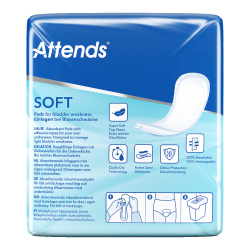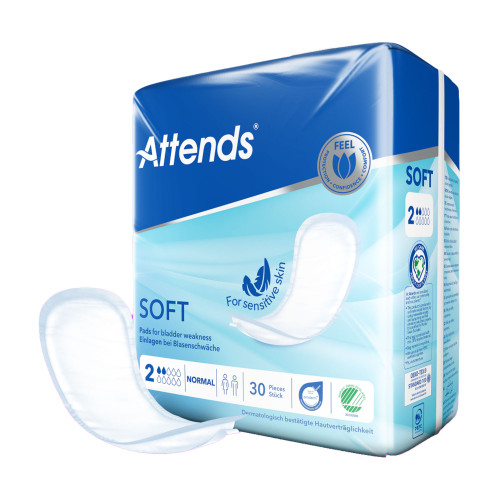 Attends Soft 2 sind diskrete saugfähige Einlagen für leichte Blasenschwäche, speziell auch für empfindliche Haut. Praktisch und dezent: einfach mit Klebestreifen in der Unterwäsche zu befestigen.