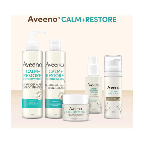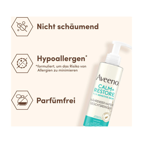 Reinigt sanft die Haut: Der pflegende CALM+RESTORE Haferreiniger von Aveeno® entfernt sanft Schmutz, Hautunreinheiten & Talg und verleiht ein beruhigtes, hydriertes & gepflegtes Hautgefühl. Die Gesichtsreinigung ist mit präbiotischem Hafer formuliert, welcher die Haut sanft pflegt und repariert. Zudem beruhigt das für seine antioxidativen Eigenschaften bekannte Mutterkraut die Haut besonders schonend. Die Gesichtsreinigung mit der nicht schäumenden Formel reinigt sanft empfindliche Haut, spendet wichtige Feuchtigkeit und hinterlässt ein gepflegtes Hautgefühl.