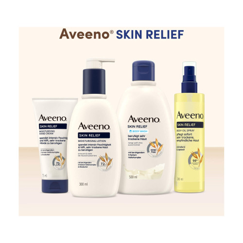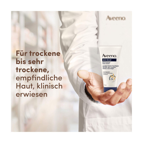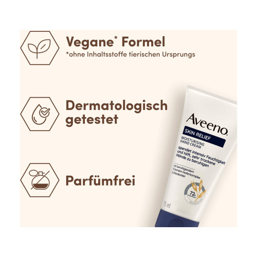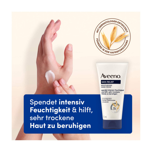 Die Aveeno® Skin Relief Handcreme spendet intensiv Feuchtigkeit & hilft, sehr trockene Hände zu beruhigen. Sie erneuert & stärkt die Hautschutzbarriere, wissenschaftlich erwiesen. Die Haut wird so vor äußeren Einflüssen geschützt und unterstützt die natürliche Ceramidproduktion. Zudem beruhigt die parfümfreie Feuchtigkeitscreme mit beruhigendem 3-fachem Haferkomplex & Sheabutter die Haut, spendet intensive Feuchtigkeit und verhindert Feuchtigkeitsverlust. Präbiotischer kolloidaler Hafer hilft, das Wachstum gesunder Hautmikroorganismen zu unterstützen und Milchsäure – einen natürlichen Feuchtigkeitsfaktor – zu fördern. Spendet wissenschaftlich erwiesen 72h* lang intensiv Feuchtigkeit und die Haut fühlt sich auch nach dem Waschen noch gut genährt an. Hilft bei sehr trockener und angespannter Haut und hinterlässt ein beruhigtes und hydriertes Hautgefühl.