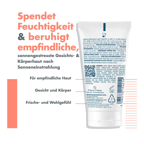 Die After Sun Lotion beruhigt sofort die empfindliche Haut, die nach dem Sonnenbad überhitzt ist. Sie versorgt Gesicht und Körper bis zu 48 Stunden lang mit Feuchtigkeit*. Ihre cremige, schmelzende Textur sorgt für ein angenehmes Gefühl von intensiver Frische. Ihre Formulierung ist reich an Avène Thermalwasser und angereichert mit Antioxidantien und pflegendem Jojobaöl, beruhigt die Haut und hüllt sie in einen zarten Duft. Sie ist geeignet für die ganze Familie, Erwachsene und Kinder, ab 2 Jahren.