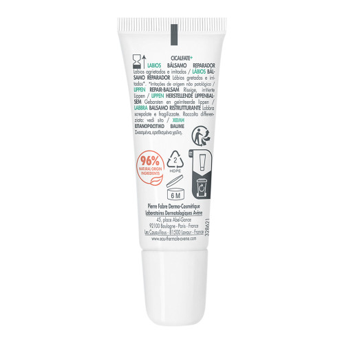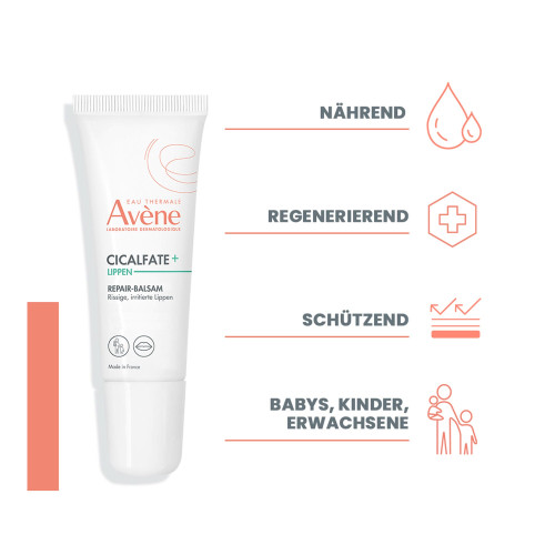 Die verbesserte Formulierung des Cicalfate+ Lippen Repair-Balsam repariert* spröde, rissige und gereizte Lippen innerhalb von 48 Stunden***. Sie ist sehr wasserfest, schützt, spendet 24 Stunden lang Feuchtigkeit** und pflegt intensiv. Die mit [C+-Restore]™, einem post-biotischen, reparierenden Aktivstoff und Avène Thermalwasser angereicherte Zusammensetzung beruhigt die Lippen und sorgt für eine schützende Barrierewirkung auf den Lippen. Dieses Pflegeprodukt für die ganze Familie besteht zu 96 % aus natürlichen Aktivstoffen und sorgt schon bei der ersten Anwendung für Wohlbefinden und Geschmeidigkeit