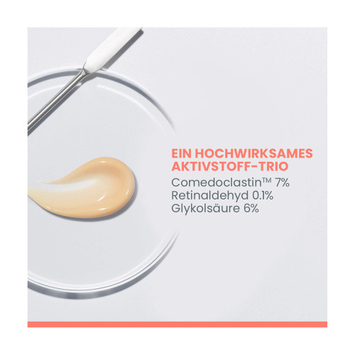 Comedomed Peeling Intensiv Anti-Pickel Akutpflege ist das neue Produkt, das Sie bei Pickelausbrüchen brauchen. Es zielt auf alle sichtbaren Unreinheiten der zu Akne neigenden Haut ab, mit einer einzigartigen und hochwirksamen Formulierung dank einer Kombination aus dermatologischen Aktivstoffen: Glykolsäure, peelt und stimuliert die Zellerneuerung für einen neuen Hauteffekt dank ihrer keratolytischen Wirkung. Retinoid-Booster, fördert die Resorption von Pickeln und die Reduzierung von Aknenarben dank einer patentierten* Kombination aus Retinal, der wirksamsten Form von Vitamin A, und Comedoclastin™. Es wird abends auf das saubere, trockene Gesicht aufgetragen, sobald die Hautunreinheiten auftreten und bis sie verschwinden, wobei die maximale Anwendungsdauer 15 Tage beträgt. Die cremige Textur sorgt für ein schnelles Einziehen und ein nicht fettendes Finish auf der Haut.