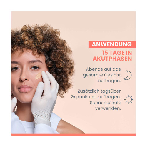 Abends auf das saubere, trockene Gesicht auftragen, sobald die Hautunreinheiten auftreten und bis sie verschwinden (maximal 15 Tage lang). Zusätzlich zweimal täglich punktuell auftragen, um Hautunreinheiten zu bekämpfen. Ohne Abspülen.