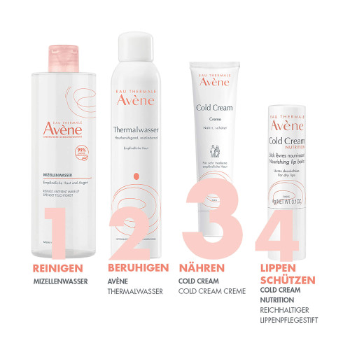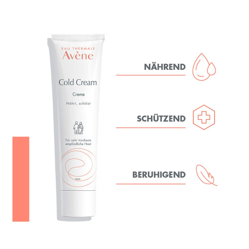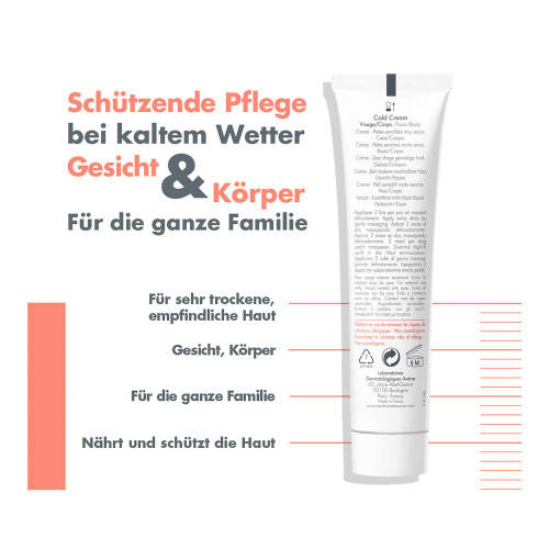 Eine Creme mit Anteilen der Avène Cold Cream, die die trockene oder sehr trockene Haut der ganzen Familie nährt, Feuchtigkeit spendet*, beruhigt und vor äußeren Aggressoren schützt. Die nährende Hautpflege wurde unter extremen Kältebedingungen getestet. Dank ihrer umhüllenden Textur und dem leichten Duft hinterlässt sie ein weiches, nicht fettendes und nicht klebendes Finish auf der Haut. Die Cold Cream von Avène ist eine traditionelle Mischung von Inhaltsstoffen, bekannt in der französischen Arzneimittelkunde, die die Haut nährt, schützt und beruhigt – auch bei extremer Kälte. Geeignet für das Gesicht und den Körper.