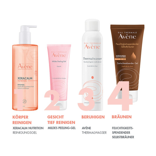 Avene Thermal Spring Water (Avene Aqua), PEG-4, Coco-Caprylate, Dihydroxyacetone, Hydroxyethyl Acrylate / Sodium Acryloyldimethyl Taurate Copolymer, Erythrulose, Benzoic Acid, BLue 1 (CI 42090), Caprylic / Capric Triglyceride, Parfum / Fragrance, Glycerin, Helianthus Annuus (Sunflower) Seed Oil (Helianthus Annuus Seed Oil), Isohexadecane, Polysorbate 60, Red 4 (CI 14700), Sodium Chloride, Sodium Sulfate, Sorbitan Isostearate, Tocopherol, Tocopheryl Glucoside, Water (Aqua), Yellow 6 (CI 15985).