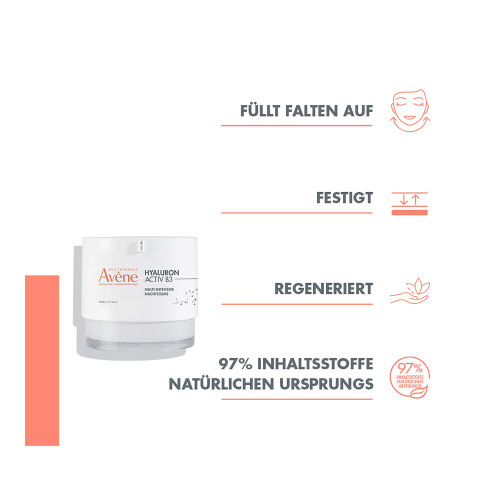 Mit zunehmendem Alter verbreiten sich alternde Zellen schneller und die Haut funktioniert langsamer. Eau Thermale Avène hat die Hyaluron Activ B3 Nachtcreme entwickelt, die Retinaldehyd, reine Hyaluronsäure, Haritaki-Extrakt und Niacinamid enthält, um der Hautalterung entgegenzuwirken und die Lebensdauer der Zellen zu verlängern.*