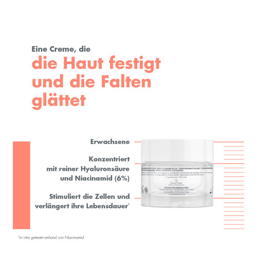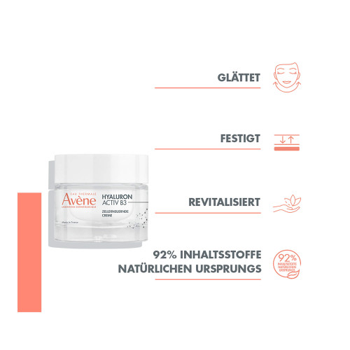 Mit zunehmendem Alter verbreiten sich alternde Zellen schneller und die Haut funktioniert langsamer. Eau Thermale Avène hat die Hyaluron Activ B3 zellerneuernde Creme entwickelt, die zu 0,2 % mit reiner Hyaluronsäure (hohes und geringes Molekulargewicht) und Niacinamid (6 %) konzentriert ist, um der Ursache der Hautalterung entgegenzuwirken und die Lebensdauer der Zellen zu verlängern.*