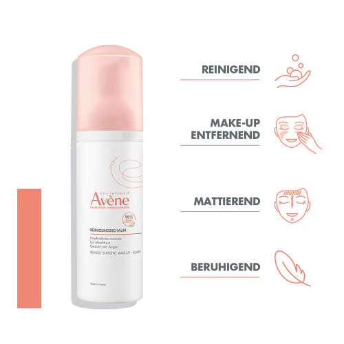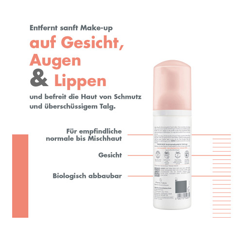 Reinigungs- und Make-up-Entfernungsschaum für die Augen und normale bis empfindliche Mischhaut, reinigt und beseitigt Unreinheiten und überschüssigen Talg. Mit 98 % Aktivstoffen natürlichen Ursprungs und ohne Bestandteile tierischen Ursprungs bewahrt sie das natürliche Gleichgewicht der Haut. Dieser reichhaltige, luftige Schaum mit zartem Duft entfernt Make-up, reinigt und beruhigt die Haut dank der Formulierung mit Avène Thermalwasser und Glycerin für mehr Komfort. Die seifenfreie Formulierung enthält ein Minimum an Aktivstoffen in der richtigen Dosierung, um Wirksamkeit und Verträglichkeit zu gewährleisten*. Hinterlässt eine klare, weiche und angenehme Haut.