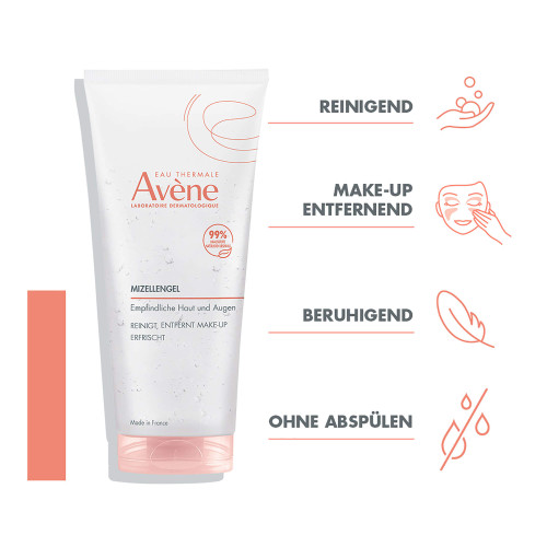 Dieses erfrischende Mizellengel zum Entfernen von Make-up reinigt, spendet Feuchtigkeit* und beruhigt empfindliche Gesichter und Augen in einem einfachen Schritt. Sie enthält 99 % Aktivstoffe natürlichen Ursprungs und keine tierischen Bestandteile. Dieses Gel beruhigt dank seiner erfrischenden und geschmeidigen Textur. Das Abschminken wird zu einem Moment der Freude. Angenehm für die Haut und mit einem zarten Duft, entfernt es Make-up und bietet Wohlbefinden in einem einfachen und schnellen Schritt. Es verbessert die Feuchtigkeitszufuhr und bewahrt das natürliche Gleichgewicht der Haut dank der Kombination von Glycerin und Trehalose und der hohen Konzentration des Avène Thermalwassers mit seinen beruhigenden Eigenschaften. Seine Formulierung enthält genau die richtige Menge an natürlichen Aktivstoffen für eine sehr gute Verträglichkeit***. Macht die Haut klar, weich, beruhigt und sorgt für Wohlbefinden. Geeignet für Träger von Kontaktlinsen.