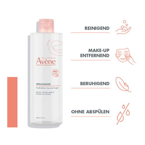 Dieses Mizellen-Reinigungslotion reinigt (sogar Verschmutzungspartikel*), spendet Feuchtigkeit** und beruhigt empfindliche Gesichts- und Augenpartien in einem einfachen Schritt. Sie enthält 99 % Aktivstoffe natürlichen Ursprungs und keine tierischen Bestandteile. Täglich entfernt dieses zart duftende Erfrischungswasser Make-up und schenkt Geschmeidigkeit in einem einfachen und schnellen Schritt. Es verbessert die Feuchtigkeitszufuhr und bewahrt das natürliche Gleichgewicht der Haut dank der Kombination von Glycerin und Trehalose und der hohen Konzentration des Avène Thermalwassers mit seinen beruhigenden Eigenschaften. Seine Formulierung enthält ein Minimum an Aktivstoffen in genau der richtigen Dosierung, um Wirksamkeit und Verträglichkeit zu gewährleisten***. Macht die Haut klar, weich, beruhigt und sorgt für Wohlbefinden. Die Mizellen-Reinigungslotion zum Entfernen von Make-up ist für Kontaktlinsenträger geeignet. Die 400-ml-Verpackung der Mizellen-Reinigungslotion zum Entfernen von Make-up besteht zu 87 % aus recycelten Materialien. Die Flasche besteht aus 100 % recyceltem Kunststoff****.