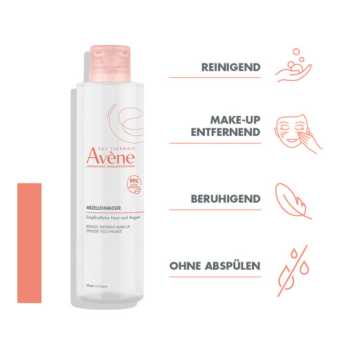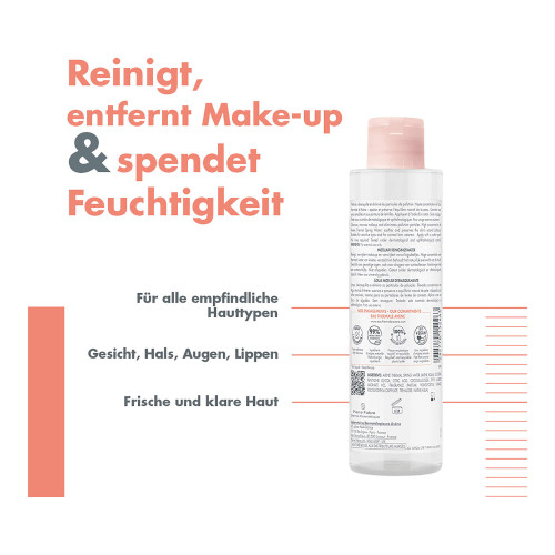 Dieses Mizellen-Reinigungslotion reinigt (sogar Verschmutzungspartikel*), spendet Feuchtigkeit** und beruhigt empfindliche Gesichts- und Augenpartien in einem einfachen Schritt. Sie enthält 99 % Aktivstoffe natürlichen Ursprungs und keine tierischen Bestandteile. Täglich entfernt dieses zart duftende Erfrischungswasser Make-up und schenkt Geschmeidigkeit in einem einfachen und schnellen Schritt. Es verbessert die Feuchtigkeitszufuhr und bewahrt das natürliche Gleichgewicht der Haut dank der Kombination von Glycerin und Trehalose und der hohen Konzentration des Avène Thermalwassers mit seinen beruhigenden Eigenschaften. Seine Formulierung enthält ein Minimum an Aktivstoffen in genau der richtigen Dosierung, um Wirksamkeit und Verträglichkeit zu gewährleisten***. Macht die Haut klar, weich, beruhigt und sorgt für Wohlbefinden. Die Mizellen-Reinigungslotion zum Entfernen von Make-up ist für Kontaktlinsenträger geeignet.