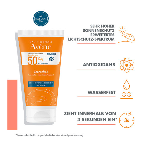 Das Avène Sonnenfluid SPF 50+ enthält das erste Filtersystem mit HEV Blue Light Filter aus der Pierre Fabre Forschung. Das innovative Filtersystem filtert neben UVB- und UVA-Strahlung auch HEV (High Energy Visible Light) Blue Light und beugt somit Hautalterung und Hyperpigmentierung vor.