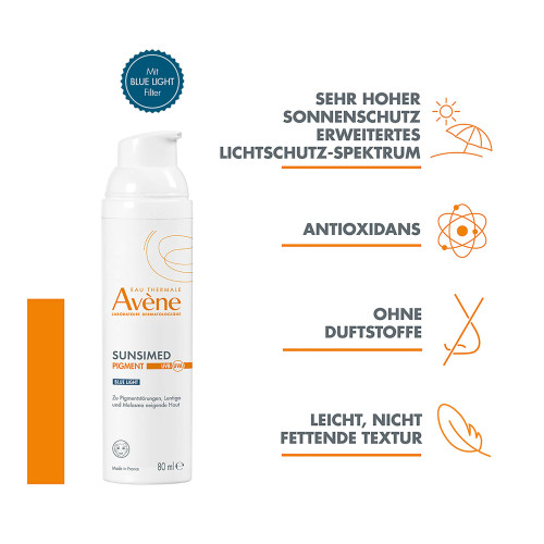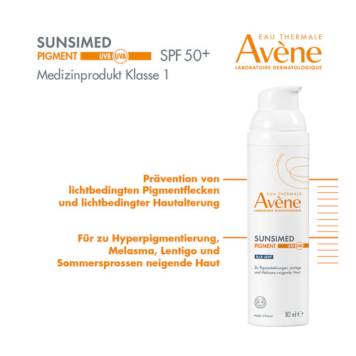 Sunsimed PIGMENT von Eau Thermale Avène ist ein medizinisches Sonnenschutzprodukt mit dem sehr hohen Lichtschutzfaktor SPF 50+. Es dient der Prävention von lichtbedingten Pigmentflecken und anderen durch Licht verursachten Zeichen der Hautalterung. Besonders geeignet ist es für Hauttypen, die zu Hyperpigmentierung, Melasma, Lentigo und Sommersprossen neigen. Durch seine exklusive Zusammensetzung bietet es einen umfassenden Lichtschutz.