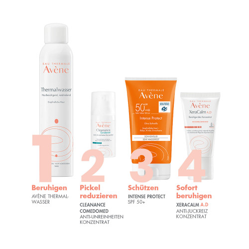 Ein Expertentipp: Für eine größere Wirksamkeit ist die Verwendung einer Kompresse die perfekte Lösung: falten Sie eine Kompresse, tränken Sie sie in Avène Thermalwasser, legen Sie sie auf den betroffene Bereich und sprühen Sie sie erneut ein. Lassen Sie es für 10 Minuten einwirken.