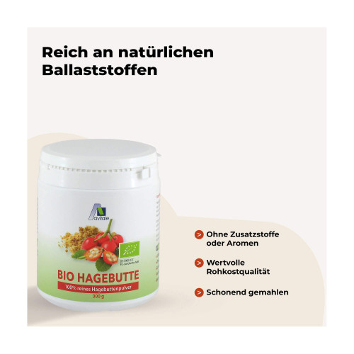 Avitale BIO HAGEBUTTENPULVER ist reich an natürlichem Vitamin C und Ballaststoffen. Es hat einen fruchtigen Eigengeschmack mit einer leichten Säurenote.