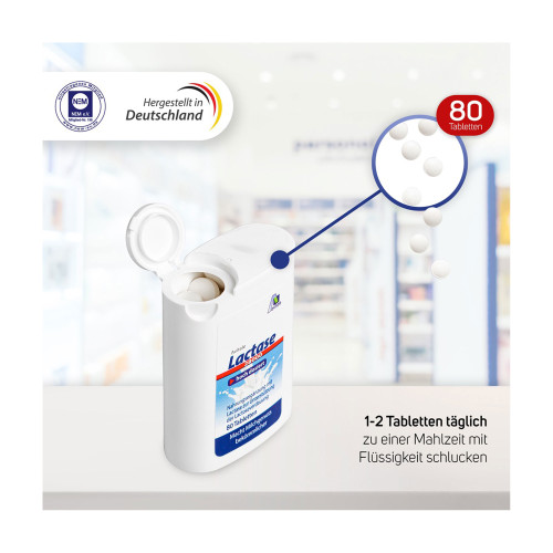 1-2 Tabletten kurz vor oder während des Verzehrs lactosehaltiger Mahlzeiten und Getränke mit etwas Flüssigkeit schlucken.